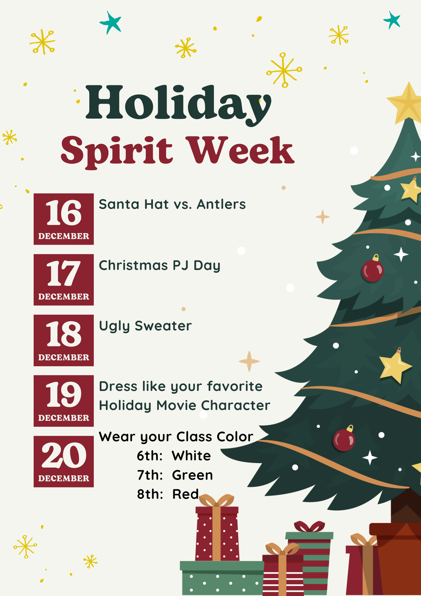 Monday: Santa Hat vs. Antlers ~ Tuesday: Christmas PJ Day ~ Wednesday: Ugly Sweater ~ Thursday: Dress like your favorite Movie Character ~ Friday: Wear your Class Color - 6th Grade: White ~ 7th Grade: Green ~ 8th Grade: Red